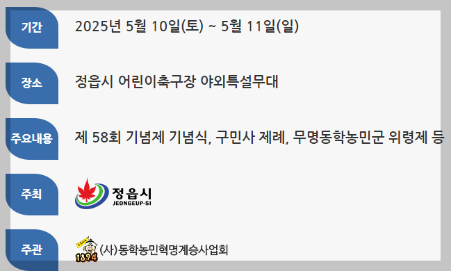 2025년에는 제58회 동학농민혁명기념제가 5월 10일부터 11일까지 정읍천 일대에서 열릴 예정입니다.