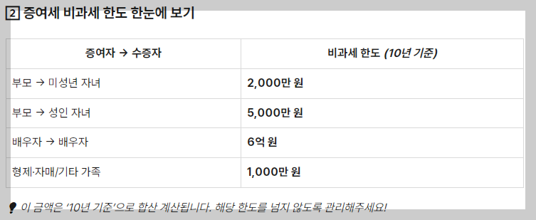 ●증여세 비과세 한도(10년 기준)를 초과하면, 초과 금액에 대해 증여세가 부과됩니다.
